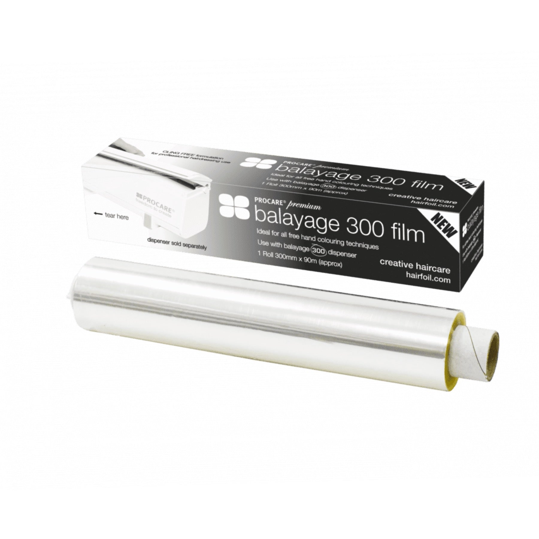 Introduce a lightness of touch to freehand colouring with Procare balayage film. Ideal for all freehand work and will not tangle, scruch or cling to the hair allowing you to work quickly and easily. Use with the balayage 300 dispenser which cuts your film with a single press of the l